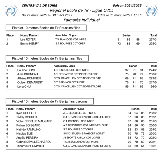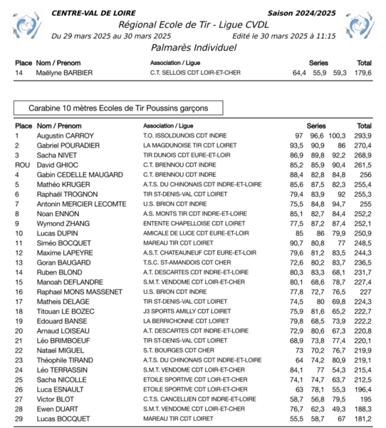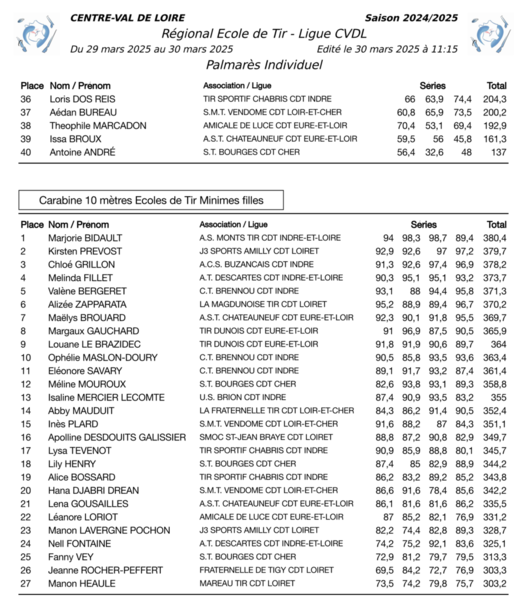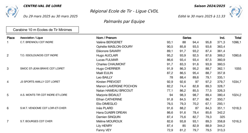 - Un super BRAVO aux 3 filles qui composent l'équipe carabine ''Minimes'', puisque l'équipe est championne de ligue Centre Val de Loire, devant 6 autres équipes.
